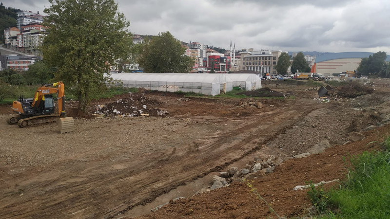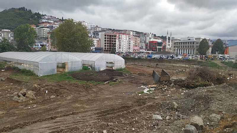 Yomra Belediyesi, Kent Meydanı projesi kapsamında derenin karşısında seralarla işgal edilen alanda yıkım çalışmalarına başladı.